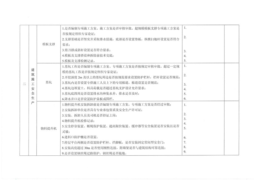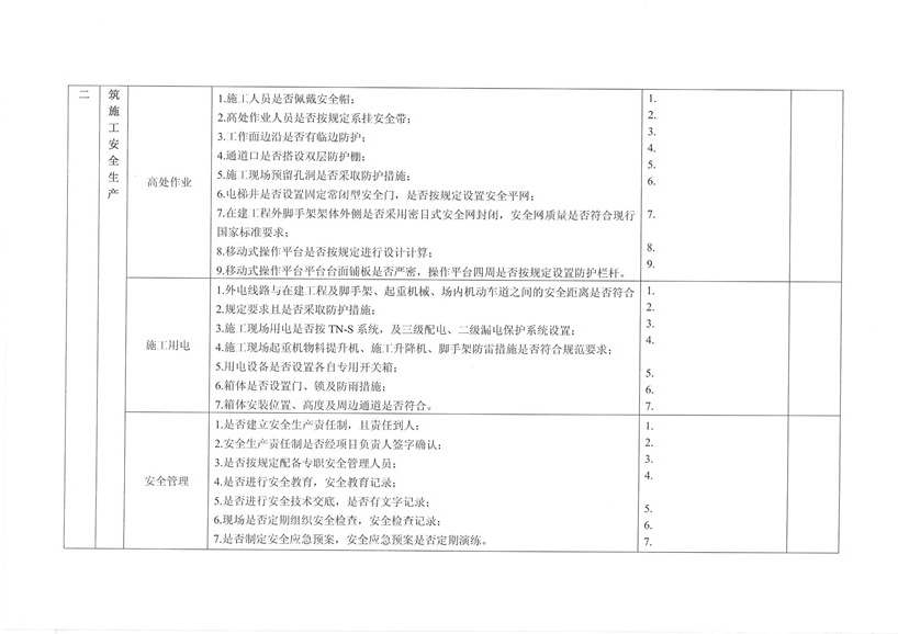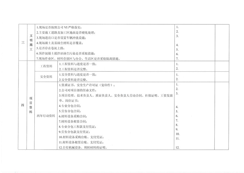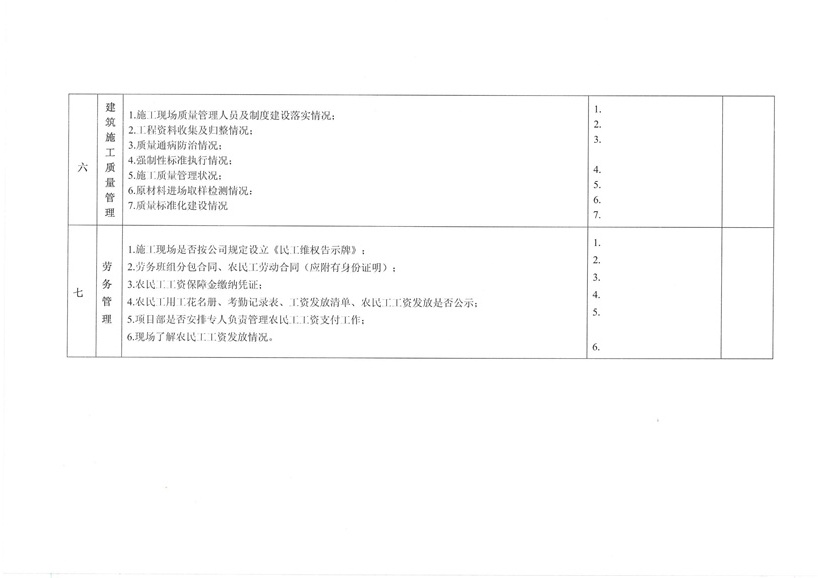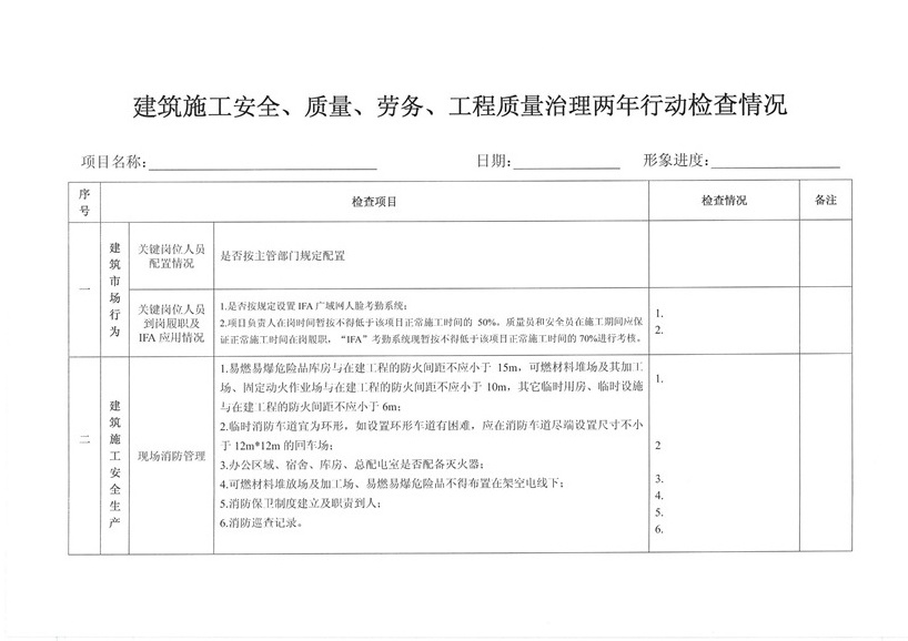 集團(tuán)公司各部室、分公司、項(xiàng)目部: 為繼續(xù)深入開展工程質(zhì)量治理兩年行動(dòng),進(jìn)一步加強(qiáng)工程安全、質(zhì)量規(guī)范管理,保障廣大農(nóng)民工合法權(quán)益,促進(jìn)項(xiàng)目工程穩(wěn)固進(jìn)展。公司決定對(duì)各在建工程開展秋季安全、質(zhì)量、勞務(wù)及工程質(zhì)量治理“兩年行動(dòng)”綜合大檢查,現(xiàn)將相關(guān)事宜通知如下: 一、檢查時(shí)間安排 2015年10月30日—2015年11月10日 二、檢查組成員 組 長(zhǎng):張濤 副組長(zhǎng):王健 組 員:胡巨偉(負(fù)責(zé)兩年行動(dòng)、市場(chǎng)檢查,周文淵配合) 陳治明(負(fù)責(zé)勞務(wù)管理,肖家駿配合) 張亞偉(負(fù)責(zé)安全生產(chǎn)管理,李芬芬、藺濤配合) 王 軍(負(fù)責(zé)質(zhì)量管理,王坤海配合) 三、檢查內(nèi)容 1、安全生產(chǎn) (1)項(xiàng)目部安全生產(chǎn)管理制度、廣域網(wǎng)IFA考勤工作及安全管理人員落實(shí)情況; (2)深基坑、高支撐、高處作業(yè)等危險(xiǎn)性較大的分項(xiàng)工程方案編制、審批、專家論證及施工防護(hù)情況; (3)塔吊、施工升降機(jī)全過程安全監(jiān)控落實(shí)和備案、檢測(cè);施工機(jī)械設(shè)備維修、保養(yǎng)臺(tái)賬落實(shí)情況; (4)腳手架、臨邊洞口防護(hù)、臨時(shí)用電布置情況; (5)文明施工、揚(yáng)塵防治、企業(yè)形象建設(shè)情況; (6)特種作業(yè)人員持證上崗、農(nóng)民工學(xué)校及工人安全教育落實(shí)情況; (7)安全資料同步整理情況。 2、質(zhì)量管理 (1)施工現(xiàn)場(chǎng)質(zhì)量管理人員及制度建設(shè)落實(shí)情況; (2)工程資料收集及歸整情況; (3)質(zhì)量通病防治情況; (4)強(qiáng)制性標(biāo)準(zhǔn)執(zhí)行情況; (5)現(xiàn)行節(jié)能標(biāo)準(zhǔn)執(zhí)行及施工質(zhì)量管理狀況; (6)原材料進(jìn)場(chǎng)取樣檢測(cè)及質(zhì)量標(biāo)準(zhǔn)化建設(shè)執(zhí)行情況。 3、勞務(wù)管理 (1)施工現(xiàn)場(chǎng)是否按公司規(guī)定設(shè)立《民工維權(quán)告示牌》; (2)勞務(wù)班組分包合同、農(nóng)民工勞動(dòng)合同(應(yīng)附有身份證明); (3)農(nóng)民工工資保障金繳納憑證; (4)農(nóng)民工用工花名冊(cè)、考勤記錄表、工資發(fā)放清單、農(nóng)民工工資發(fā)放是否公示; (5)項(xiàng)目部是否安排專人負(fù)責(zé)管理農(nóng)民工工資支付工作; (6)現(xiàn)場(chǎng)了解農(nóng)民工工資發(fā)放情況。 4、工程質(zhì)量治理兩年行動(dòng) (1)施工現(xiàn)場(chǎng)是否設(shè)立專人負(fù)責(zé)工程質(zhì)量治理兩年行動(dòng); (2)施工現(xiàn)場(chǎng)工程質(zhì)量治理兩年行動(dòng)資料是否完整; (3)現(xiàn)場(chǎng)資料是否按上級(jí)主管部門下發(fā)文件及表格進(jìn)行整理。 各項(xiàng)目部接到通知后應(yīng)將文件內(nèi)容傳達(dá)至各項(xiàng)目管理人員,并立即開展自查自糾,高度重視本次檢查。同時(shí)各項(xiàng)目負(fù)責(zé)人、項(xiàng)目經(jīng)理及勞務(wù)專員應(yīng)切實(shí)保障農(nóng)民工工資按月足額發(fā)放,杜絕拖欠農(nóng)民工工資行為的發(fā)生。在對(duì)本次檢查中發(fā)現(xiàn)的問題公司將下發(fā)限時(shí)整改通知單,對(duì)不按時(shí)整改、不回單、現(xiàn)場(chǎng)較差的項(xiàng)目部公司將進(jìn)行通報(bào)批評(píng)和嚴(yán)厲處罰。 二〇一五年十月二十六日