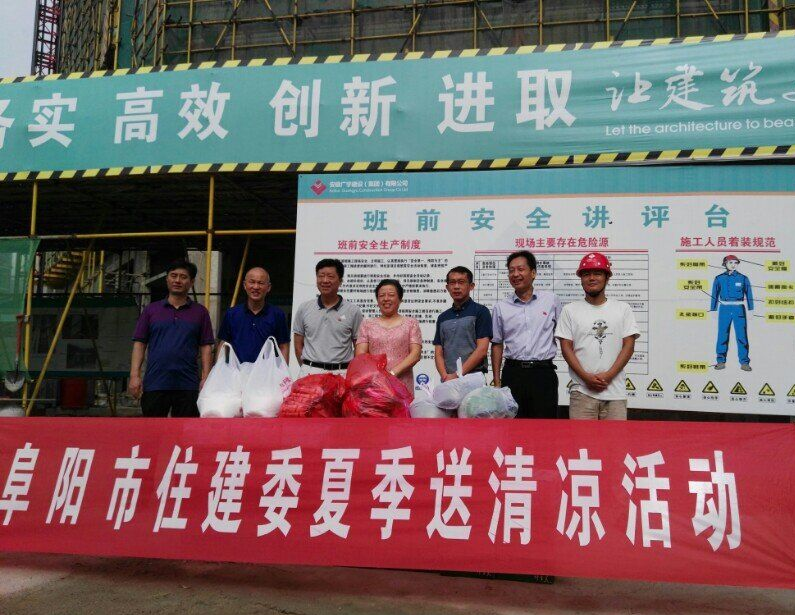 8月10日上午,市住建委機(jī)關(guān)黨委書記丁麗群、市建管局局長(zhǎng)馬西榮、市質(zhì)監(jiān)局局長(zhǎng)楊亞軍、市建管局副局長(zhǎng)鈕扣、市建管局安全辦主任丁義龍、市建管局開發(fā)區(qū)分局局長(zhǎng)李猛等同志帶領(lǐng)慰問組來到我司商廈國際項(xiàng)目的施工現(xiàn)場(chǎng),集團(tuán)公司董事長(zhǎng)張濤、副總經(jīng)理張亞偉同志陪同,將防暑降溫用品發(fā)放到一線工人手中,對(duì)施工人員高溫下的辛勤工作表示感謝和慰問,并詳細(xì)詢問了工程進(jìn)展及各項(xiàng)安全措施落實(shí)情況,要求施工負(fù)責(zé)人一定要做好現(xiàn)場(chǎng)勞動(dòng)保護(hù)和防暑降溫工作,合理安排施工時(shí)間,切實(shí)保障施工人員的身心健康。同時(shí)叮囑施工人員在炎熱天氣下工作,要注意自我調(diào)節(jié),保重身體,防止高溫中暑。
